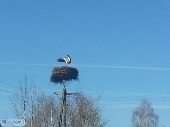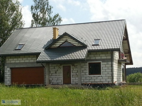 Nowy Domek (ok. 202 netto, użytkowa ok. 140m2) posiada duży salon z kuchnią i łazienką na parterze, połączony z dużym dwustanowiskowym garażem posiadającym kanał z nowoczesną, bardzo cichą bramą firmy Hormann na pilota oraz 4 pokoje z łazienką na użytkowym poddaszu. Dom jest w stanie surowym zamkniętym(czyli możliwość aranżacji, wystroju, itd. może być po stronie nowego właściciela) jest postawiony na małym wzgórzu, z którego rozpościera się przez wielkie tarasowe podwójne okna przepiękny widok na okoliczne pola, łąki, lasy pełne grzybów i jagód po których przemieszczają się sarny, jelenie, łosie, liski. Na pobliskim słupie energetycznym co roku przylatują Bociany a na lęgowiska, tereny lekko podmokłe Żurawie. Domek zbudowany jest z bardzo dobrych materiałów, czyli bloczków silikatowych, poddasze ocieplone podwójnie wełną mineralną oraz zabezpieczone folią paraizolacyjną. Dach pokryty jest zieloną blachodachówką Ruukki, kominy z cegły klinkierowej w lekkim kolorze żółtego. Okna plastykowe w kolorze złoty dąb o bardzo dobrej jakości na parterze jak i poddaszu. Okna i drzwi tarasowe oraz okna połaciowe w każdym z pokoi na poddaszu. W domu jest też kominek ok. 14kw. Do domu kablem ziemnym doprowadzony jest prąd 220-240V plus siła ok 400V i specjalny przełącznik na własny generator prądu. Z własnej studni głębinowej doprowadzony jest plastykowy bardzo trwały wąż do wody.